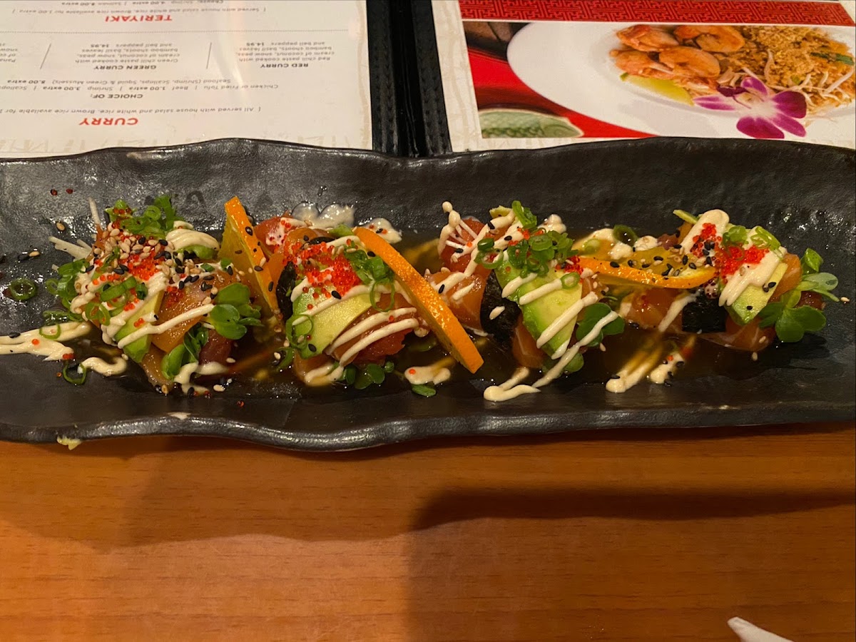 Shrimp tempura, avocado, asparagus, scallions, I/O topped with a layer of spicy tuna, avocados, spicy mayo and eel sauce